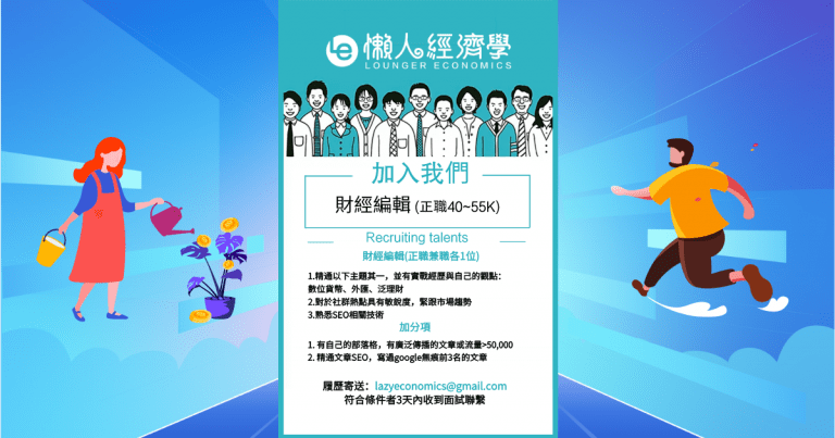 懶人經濟學徵才啦!目前徵求財經編輯相關人才,歡迎對投資理財有熱誠、有想法、不想做螺絲釘的朋友加入我們!