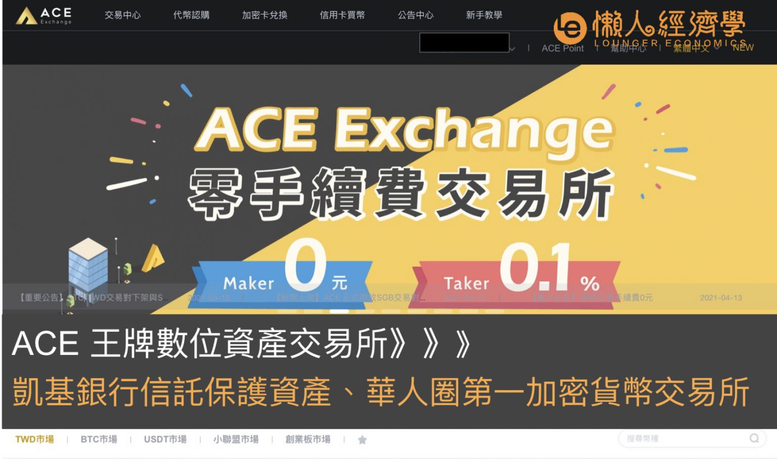 台灣的加密貨幣交易所何其多,挑選交易所時,除了選擇會靈活推出符合趨勢新產品的交易所,交易所擁有穩定的信託合作單位也非常重要!介紹一間能滿足這兩個條件的加密貨幣交易所——ACE 王牌數位資產交易所,ACE交易所目標成為華人圈頂級專業的加密貨幣交易所,擅長推出符合趨勢且操作簡單的產品、ACE交易所的手續費更是小資友善,讓ACE廣受幣圈喜愛。