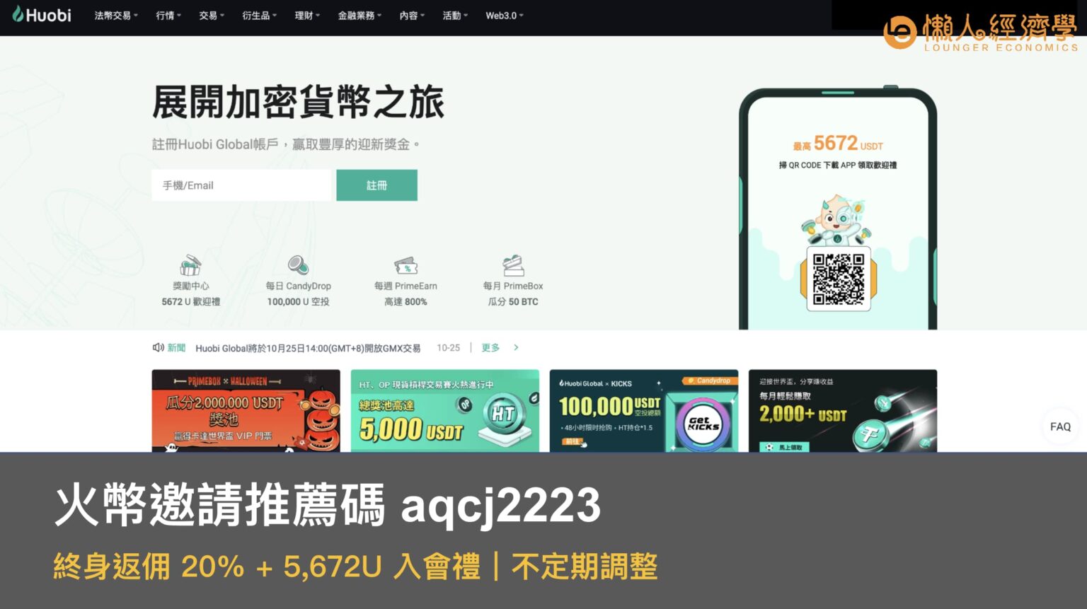 火幣邀請推薦碼【aqcj2223】終身返佣 20%+ 5,672U 入會禮|不定期調整