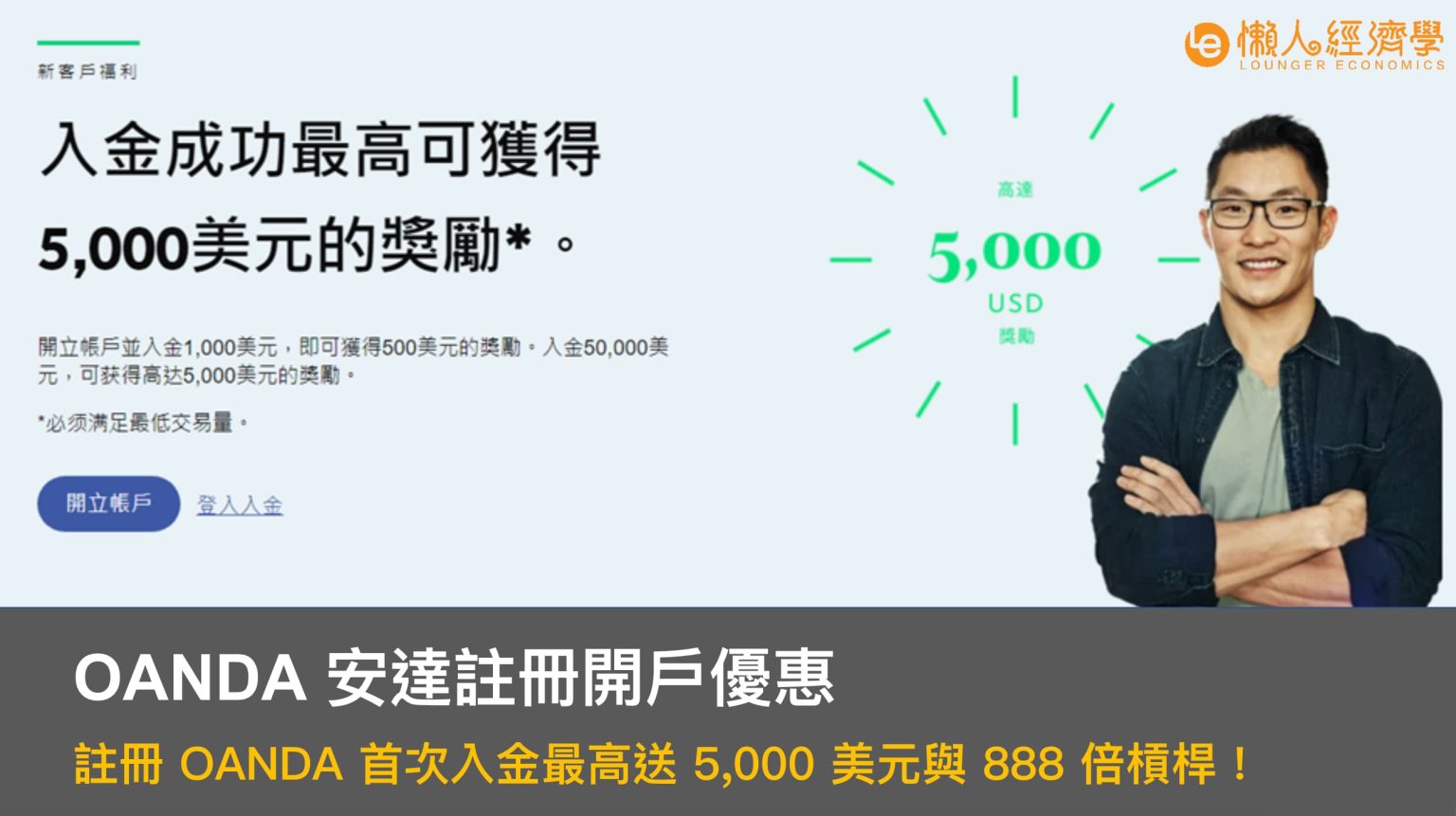 透過懶人經濟學的連結註冊 OANDA 安達外匯平台,首次入金最高可領取 5,000 美金以及享有 OANDA 安達的低點差福利!