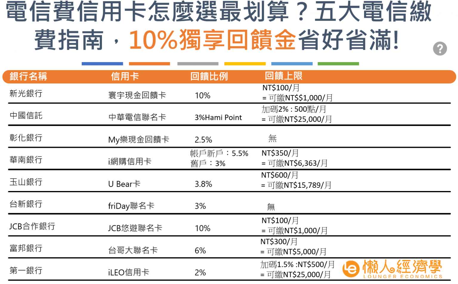 每家電信繳費推薦的信用卡略有不同,我也直接以各家電信費做區分,分別表列如下: