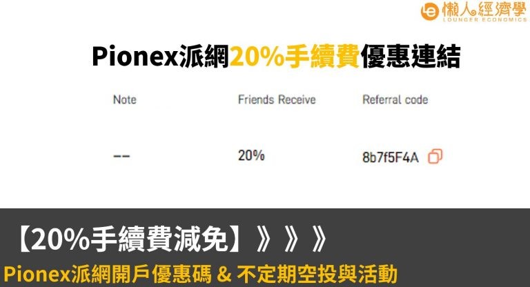 現在透過懶人經濟學的連結前往Pionex派網交易所,即可享有終身20%手續費減免的優惠活動,包含2021/8/28之前透過懶人經濟學派網推薦邀請碼前往的舊用戶(系統自動調整),以及2021/8/28後註冊的新用戶。