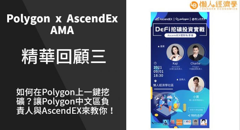 這篇文章主要紀錄懶人經濟學與Polygon、AscendEx聯合舉辦AMA的精華內容。參與人為懶人經濟學創辦人小賈、Polygon 中文區總負責人Charlie (TG:CBB12345)與AscendEX中文本地區負責人 Kaji。
