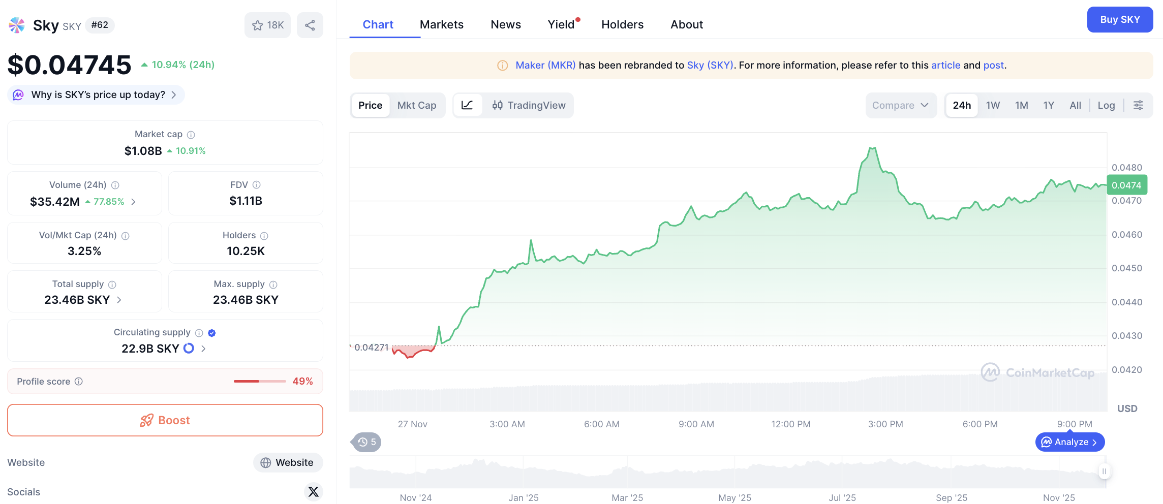 - 特色: 雖然不是純粹的 RWA 平台,但 MakerDAO 是最早將 RWA 引入其協議的 DeFi 巨頭之一。它接受 RWA 作為抵押品,鑄造穩定幣 DAI,這使得 MakerDAO 的資產儲備更加多元化和穩健。不過現在已重整為 SKY。
